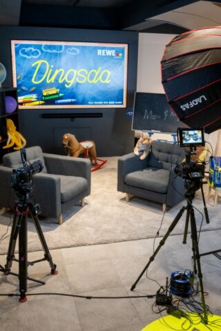 We customise the set design according to your wishes to represent your brand perfectly, e.g. with our 98’ screen in our recording studio. The green roof terrace, the spacious kitchen or a cozy seating area are also available as locations at the MAXFIVE Medienhaus. Thanks to our large international team, recordings can be made in various European languages.